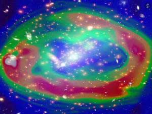 不過,有一個事實是確定無疑的:大自然已經將星系團轉變成了一個強大的粒子加速器,其功能要比目前歐洲粒子物理研究所的巨大核強子碰撞器強大20倍。研究組成員斯蒂芬-帕爾塔尼說:“當然,與之相比,蛇夫座星系團要大得多,巨大核強子碰撞器的直徑是27公里,而蛇夫座星系團的直徑有200萬光年。”目前世界上功能最強大的人造核粒子加速器位于歐洲粒子物理研究所在瑞士粒子物理實驗室創建的“巨大核強子碰撞器”。正如恒星與行星起源于松散的塵埃和氣體云團一樣,星系也是起源于大得多的凝結塊。當星系在空間移動時,自身巨大的引力將持續拖動環繞周圍的塵埃及氣體云。當它們發生碰撞或凝結成團時,產生的巨大能量將壓縮和加熱云團。