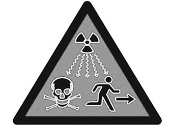 新標志為黑框紅底三角,內有一個輻射波標記、一個骷髏頭標記和一個逃跑的人形。